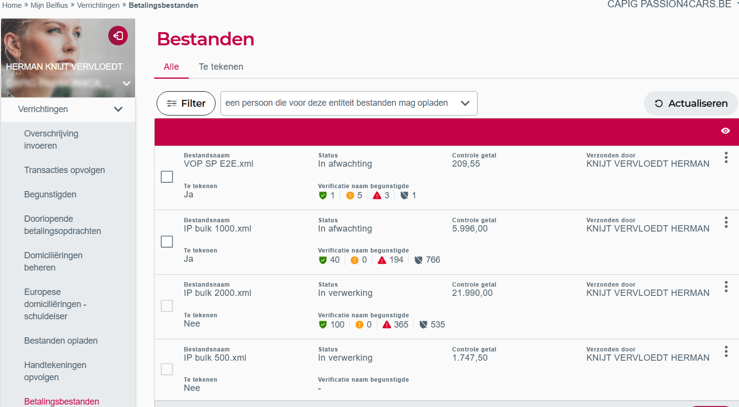 Koos u voor de controle van de naam van de begunstigde, dan krijgt u eerst een globaal resultaat voor uw bestand. Vervolgens kan u het resultaat per betaling bekijken.