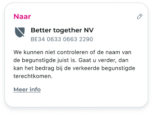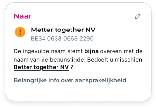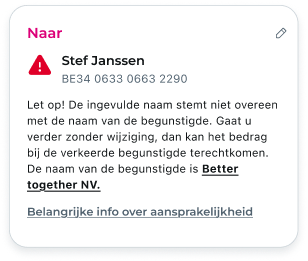 Stemmen de ingevoerde naam en IBAN van de begunstigde niet (volledig) overeen, en twijfelt u, dan raden we u aan om altijd de begunstigde te controleren. Zo vermijdt u fraude en foute overschrijvingen.