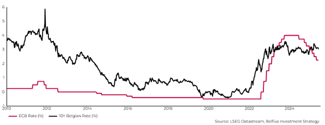 Le graphique ci-dessous montre l'évolution des taux d'intérêt directeurs dans la zone euro et le taux d'intérêt d'une obligation d'État belge à 10 ans.