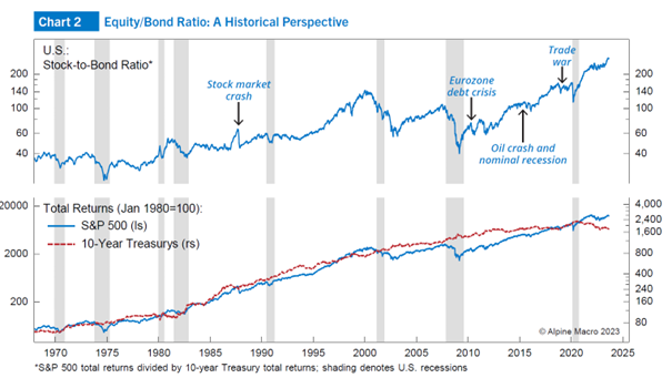 Un graphique du bureau d'études indépendant Alpine Macro remonte jusqu’en 1968 et montre quand les obligations enregistrent de meilleures performances que les actions. Le ratio ‘actions/obligations’ est défini en divisant le rendement boursier total de la bourse américaine par le rendement total d'un portefeuille obligataire composé d'obligations d’État américaines d'une durée de 10 ans. Les zones grisées sont les périodes où l’économie américaine se contractait et tombait en récession.2