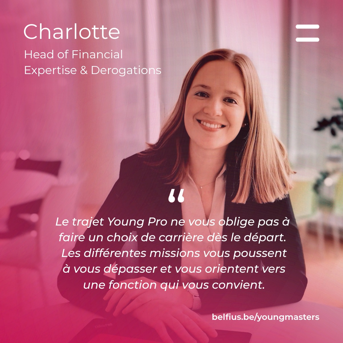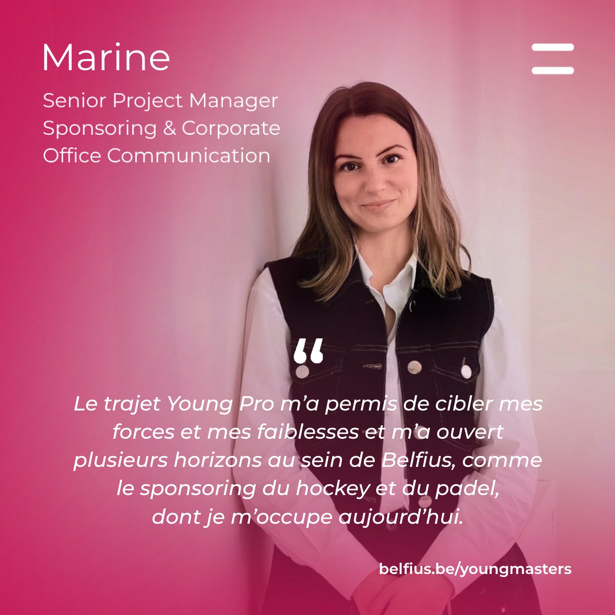 Tout comme Marine, Charline, Charlotte, Clara et Sybren qui ont suivi ce trajet il y a quelques années et qui nous expliquent brièvement comment, grâce au programme Young Pro, ils ont pu acquérir l’expérience et l’expertise nécessaires pour orienter eux-mêmes leur carrière vers une fonction stratégique et à responsabilité. Leur point commun? Ils occupent aujourd’hui un job avec un réel impact.