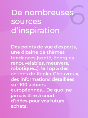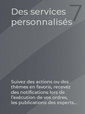 Une action représente une partie du capital d'une entreprise. Si vous achetez des actions en bourse, vous devenez copropriétaire de l'entreprise à hauteur du pourcentage d'actions que vous possédez. En tant qu'actionnaire, vous avez droit à des informations, notamment sur les comptes de l'entreprise, sa stratégie, etc. Vous disposez aussi généralement d'un droit de vote à l'assemblée générale des actionnaires. Vous partagez les bénéfices, ainsi que les pertes, dans la limite de votre investissement. Les actions comportent des risques et des frais. Le capital et/ou le rendement n’est/ne sont pas garanti(s) ou protégé(s). En savoir plus sur les principales caractéristiques.