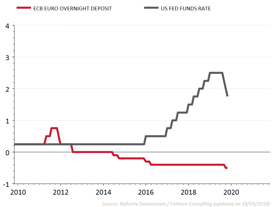 La diminution du taux américain signifie-t-elle qu’une pression supplémentaire va à présent être exercée sur la BCE pour qu’elle fasse de même ? Pas directement. Comme le montre le graphique, les banques centrales des deux côtés de l’Atlantique ont appliqué une politique de taux totalement différente durant la période 2015-2018. À partir de 2016, la Fed a réagi à une augmentation de l’inflation américaine par une série de hausses de taux. En trois ans, le taux directeur américain est passé – d’ailleurs contre la volonté du président Trump - de 0,25 % à 2,5 %. La Fed a ainsi constitué une marge d’intérêt considérable qu’elle peut à présent utiliser pour faire face au ralentissement de la croissance mondiale. Un contraste frappant avec la situation dans la zone euro. À partir de 2016, la BCE a poursuivi sa politique de baisse des taux parce que l’inflation restait inférieure à l’objectif de 2 %. Le résultat est un taux directeur négatif dans la zone euro, où des diminutions de taux supplémentaires ne servent plus à grand-chose pour stimuler la croissance économique.