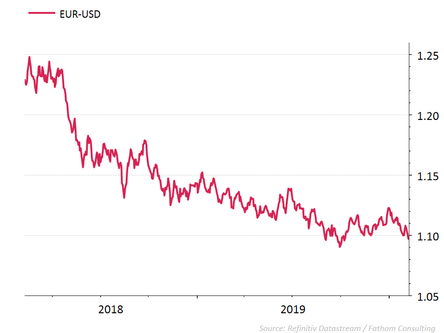 Le spread de taux d'intérêt qui menace encore de s’accentuer en raison des surperformances des États-Unis joue en défaveur de l'euro. Le cours euro-dollar a perdu plus de 2% par rapport au début de l’année, flirtant avec la barre de 1,09 $, son point le plus bas de 2019 (voir graphique). En l’absence d’une reprise de l’activité digne de ce nom dans la zone euro, il y a peu de chance de voir remonter le cours de l’euro.