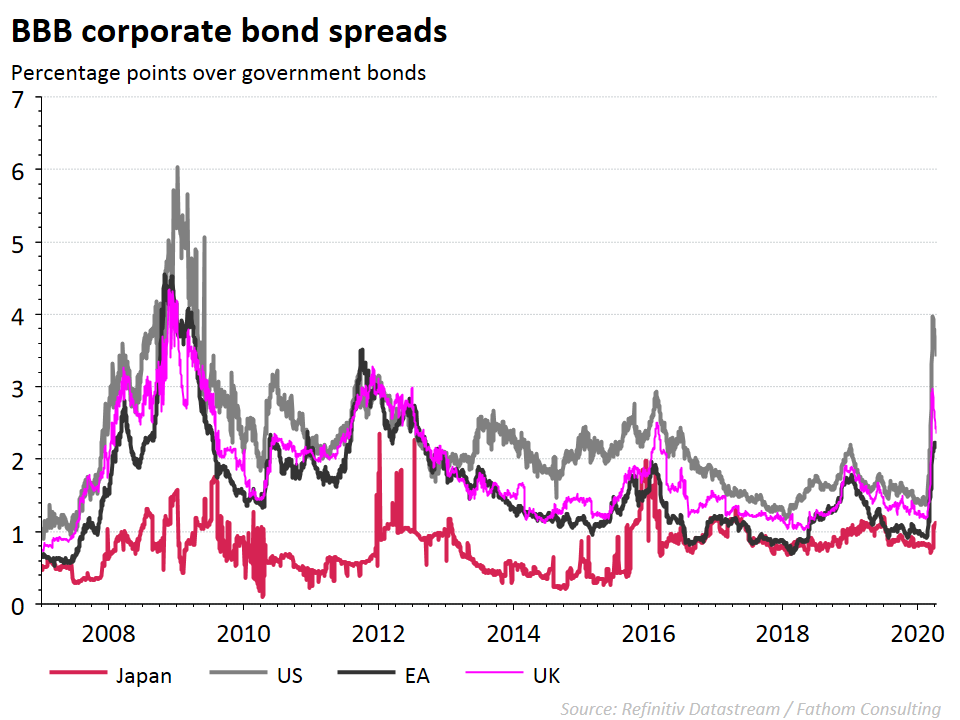 Contrairement à ce qui se passe en Europe, les entreprises américaines récoltent des fonds principalement sur les marchés des capitaux, par le biais d'émissions d'obligations (« corporate bonds »). Depuis l’éclatement du virus du Covid-19, le marché des obligations d’entreprises est sous haute tension. Celui qui investit dans ces obligations s'attend à une vague de baisses des notations et redoute une augmentation du nombre de « defaults » impliquant que les entreprises ne remboursent plus leurs dettes. Le risque est le plus élevé dans les secteurs qui sont actifs dans les marchés de consommation (voyages, retail, horeca) et dans les entreprises qui s'appuient fortement sur les chaînes d'approvisionnement internationales, comme les fabricants automobiles. Le secteur de l'énergie américain surtout souffre fortement après l’énorme baisse des prix pétroliers.