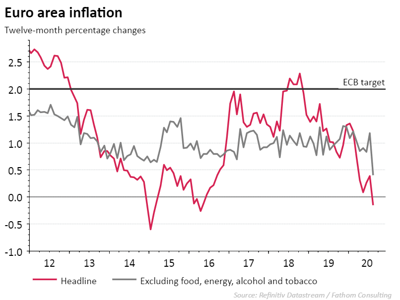 Toutefois, en ce qui concerne son objectif d’inflation de 2 pour cent, la BCE a encore un long chemin à parcourir. En août, l’inflation européenne est passée sous zéro. Bien que cette baisse des prix soit en grande partie imputable à des facteurs uniques, comme une diminution temporaire de la TVA en Allemagne, des réductions de prix dans le secteur touristique pendant le dernier mois de l’été et le report de la période des soldes dans plusieurs pays, elle ne se fait pas dans le bon sens. On s’attend cependant à ce que l’inflation augmente de nouveau au cours des prochains mois à la suite de la disparition de ces facteurs uniques et d’une hausse progressive des prix de l’énergie. Dans la phase actuelle de la récession, la pression à la baisse sur les prix continue néanmoins à prédominer (cf. aussi notre article: Zone euro: la pression inflationniste à la baisse domine).
