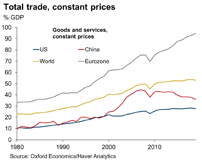 Le ralentissement de la croissance du commerce international s’explique par différents facteurs. D’une part, la part des exportations dans le PIB chinois ne cesse de diminuer parce que les Chinois consomment toujours plus eux-mêmes et que la demande domestique est devenue proportionnellement plus grande. D’autre part, le protectionnisme s’est accru ces dernières années, avec entre autres la guerre commerciale entre les États-Unis et la Chine et le Brexit. Enfin, les coûts environnementaux des longues chaînes font l’objet d’une plus grande attention.