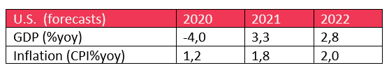 Nous prévoyons que la croissance du PIB américain ralentira fortement au quatrième trimestre et restera faible également au premier trimestre de 2021 en raison des nouvelles mesures de confinement. Dans le courant du premier trimestre, nous estimons que le président Biden réussira à faire approuver par le Congrès un plan de soutien de quelque 1 000 milliards de dollars, ce qui représente grosso modo 5 % du PIB. Ces mesures donneront un coup de fouet à la demande économique au deuxième trimestre aux États-Unis. Lorsque la vaccination battra son plein et que la population aura constitué une immunité suffisante contre le virus, la confiance des consommateurs se redressera également et les secteurs de l’horeca et du tourisme devraient connaître une belle reprise.