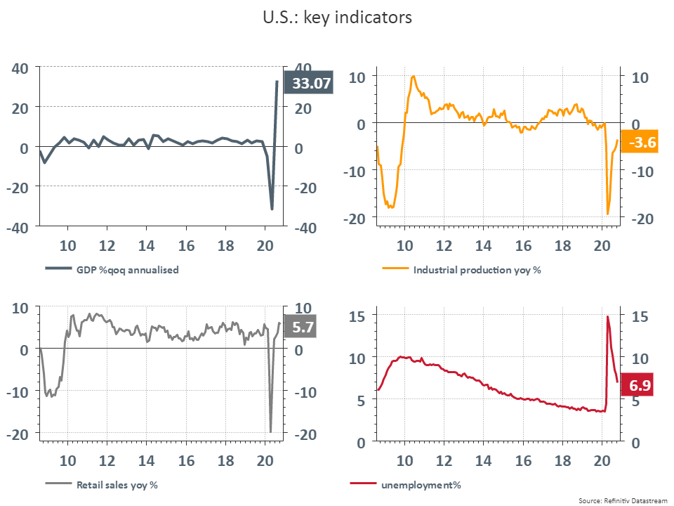 La reprise de l’industrie américaine pourrait également s’essouffler durant cet hiver, mais le secteur est en bonne position pour reprendre de la vitesse lorsque la troisième vague de contaminations sera passée. Les enquêtes auprès des entreprises indiquent en tout cas que l’activité continue d’augmenter, et les carnets de commandes sont également bien remplis.