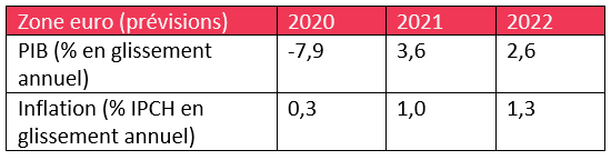 Selon notre scénario de base, le PIB de la zone euro devrait, après une contraction de près de 8 % en 2020, enregistrer une progression de 3,6 % l’année prochaine. Le premier semestre de 2021 restera difficile, mais la vaccination d’une grande partie de la population et une politique budgétaire expansive permettront dès l’été de relancer la consommation et la production. Il faudra encore probablement plusieurs années pour pouvoir rattraper le retard économique, ce qui risque de maintenir la pression inflationniste dans la zone euro à un faible niveau durant un certain temps encore.