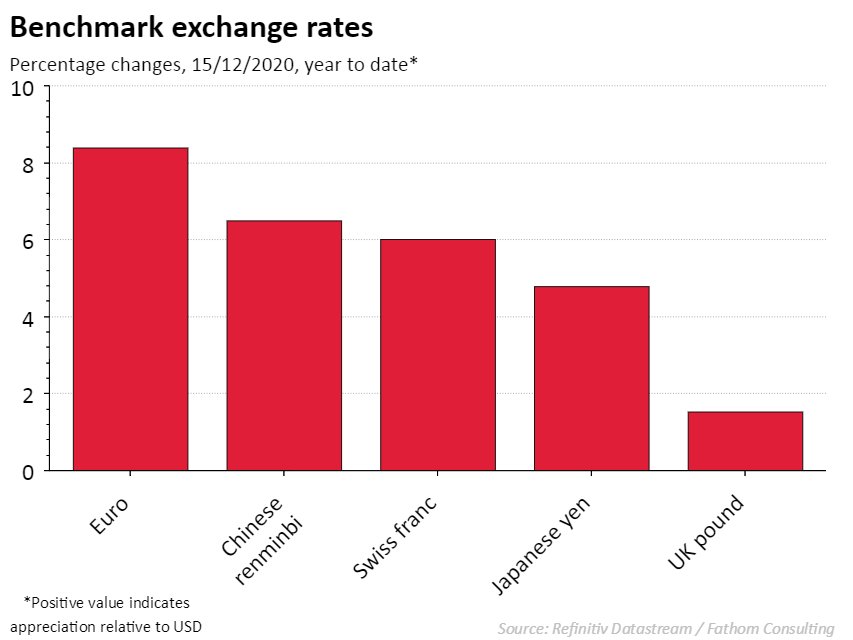 Quel est donc le problème du dollar américain ? Au moment où nous écrivons ces lignes, le taux de change euro-dollar affiche 1,21, soit le niveau le plus élevé depuis avril 2018. Cette année, la valeur du dollar a lâché plus de 8 pour cent par rapport à l’euro. Mais face au yen japonais, au yuan chinois et à de nombreuses autres devises également, le billet vert a cédé du terrain en 2020. Les analystes s’attendent à ce que la tendance du dollar reste à la baisse l’an prochain.