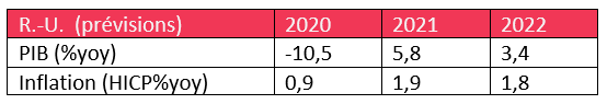 Après un repli historique de plus de 10 pour cent en 2020, nous prévoyons une croissance économique de 5,8 pour cent en 2021. Nous prévoyons une hausse de l’inflation au premier trimestre sous l’effet de la hausse des prix de l’énergie et de l’impact temporaire du Brexit. Les taxes se stabiliseront ensuite.