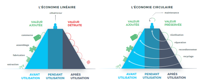 Les événements de l’année écoulée ont mis en évidence les failles de notre modèle économique actuel. La crise du Covid-19 a clairement démontré que les chaînes d’approvisionnement de l’ancien système linéaire de production et de consommation peuvent rapidement être bouleversées. L’économie circulaire offre une alternative à l’économie linéaire, dans le cadre de laquelle les matières premières sont exploitées, utilisées et rejetées. Dans une économie circulaire, les matériaux et produits ne sont pas gaspillés et sont réinjectés dans le système. Elle vise à maintenir le plus longtemps possible la valeur des matériaux et ressources dans l’économie et à réduire le plus possible la quantité de déchets. (voir graphique)
