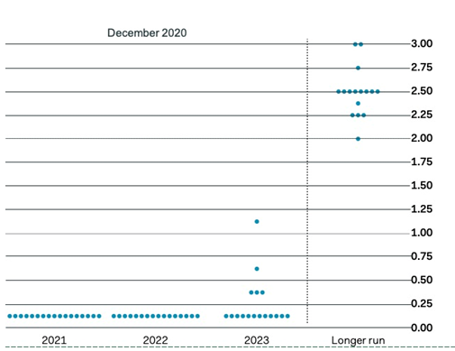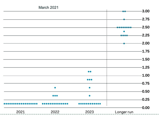 Outre les perspectives économiques, on attendait également avec beaucoup d’impatience le ‘dot plot’ de la Fed. Ce graphique indique à quel niveau les banquiers centraux projettent le taux directeur à moyen terme. En décembre, la Fed était unanime pour dire que le taux commencerait à augmenter au plus tôt en 2023. Le nouveau ‘dot plot’ de mars montre que quatre banquiers centraux sur 19 tiennent compte d’une augmentation possible des taux en 2022. Provisoirement, une large majorité au sein de la Banque centrale américaine ne voit pas de raison de lever le pied de l’accélérateur.