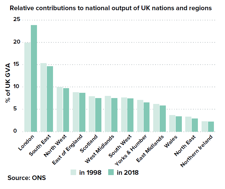 Car le gouvernement conservateur britannique entend lui aussi investir davantage dans l’infrastructure, l’innovation et la transition énergétique. Et ce, en mettant plus encore que par le passé l’accent sur le développement économique en dehors de Londres et du sud-ouest du R.-U. Au cours des dernières décennies, la croissance économique a surtout profité à la capitale et à sa région limitrophe. Creusant ainsi l’écart de prospérité entre les régions. En 1998, Londres contribuait à la création de valeur ajoutée brute du Royaume-Uni à hauteur de 20%. En 2018, ce chiffre avait déjà grimpé à 24% (voir graphique).