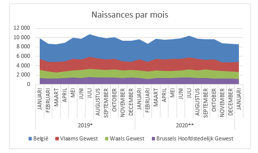 Au début de la pandémie, beaucoup plaisantaient sur le fait que les confinements provoqueraient un baby-boom et une montée en flèche du nombre des naissances. Mais presqu’un an plus tard, il semble que ce soit le contraire qui se produise. Selon des chiffres provisoires du gouvernement, en janvier 2021, dans notre pays, on a recensé 1.035 naissances en moins par rapport à janvier 2020, soit une chute de 10,7 pour cent. Depuis l’été 2020, on constate un net recul du nombre des naissances en Belgique (Graphique 1).