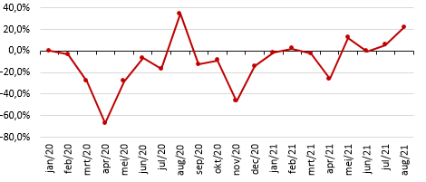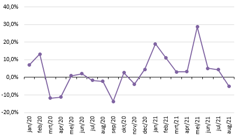 En raison du télétravail obligatoire, nombreux sont ceux qui se sont vus contraints d'équiper entièrement leur lieu de télétravail en matériel informatique. Malgré une rechute des ventes après le premier confinement l’an dernier, nous ne constatons pas cet effet après la clôture de l’an passé. Au contraire, les chiffres d'affaires sont solides cette année (voir Graphique 3). Au premier semestre, les ventes étaient en moyenne de 10% plus élevées que le niveau normal. Nous constatons un creux en août par rapport à l’année de référence 2019, mais il faut attendre pour savoir si cette tendance se poursuivra.