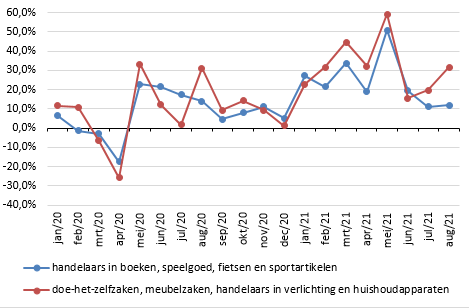 Les magasins de bricolage et, en général aussi, les magasins de meubles, éclairages et appareils électroménagers, ainsi que les vendeurs de livres, jouets, vélos et articles de sport sortent gagnants de cette pandémie. Celle-ci a eu pour conséquence que le Belge s’est retranché chez lui et qu’il a consacré son argent à l’équipement et l’embellissement de son habitation. La plupart de ces magasins s’en sont bien sortis l’an dernier. Cet effet positif se poursuit et s’est même renforcé au début de cette année (voir Graphique 2). Au premier semestre, les chiffres d'affaires étaient en moyenne de 28% (livres, jouets, articles de sport) à 34% (bricolage, meubles, appareils électroménagers) plus élevés que durant la même période en 2019. Ces chiffres d’affaires élevés des magasins de bricolage résultent également en partie des fortes hausses de prix des matériaux de construction, ce qui ne contribue pas nécessairement à la rentabilité de ces magasins.