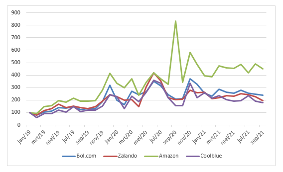 Si l’on considère le nombre de transactions ou de commandes en ligne (voir Graphique 2), on constate une augmentation similaire au cours des dernières années. En 2020, « année Covid », le nombre de commandes était environ 80 % (Bol.com, Zalando) à 90 % (Amazon, Coolblue) plus élevé qu'en 2019. Au cours des 9 premiers mois de cette année, on a constaté une augmentation par rapport à l'année dernière chez Bol.com et Amazon, et une diminution du nombre de transactions chez Zalando et Coolblue.
