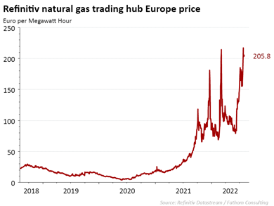 Entre-temps, la Russie a déjà arrêté de livrer du gaz à la Pologne, la Bulgarie, la Finlande, au Danemark et aux Pays-Bas et a réduit l'approvisionnement de l’Allemagne, de l’Italie, de la France et d'autres pays. Le volume qui circule encore dans les pipelines vers l’Europe est surveillé avec angoisse. Alors qu’il y a deux semaines, le soulagement a été grand quand les livraisons ont repris après la maintenance du pipeline Nord Stream 1, la Russie a resserré le robinet un peu plus loin la semaine dernière. Il ne circule plus que 20% de capacité dans ce pipeline essentiel qui approvisionne principalement l’Allemagne. Les prix du gaz ont explosé à l’avenant, pour atteindre 220 euros/mégawatt/heure, et ils se maintiennent actuellement à un niveau extrêmement élevé d’environ 200 euros/mégawatt/heure (voir graphique). Pour la Russie, ces prix astronomiques compensent largement la diminution du volume fourni.