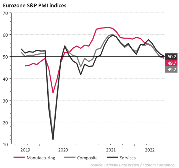 On note une forte baisse de la production dans des secteurs industriels tels que les matériaux de base et le secteur automobile, mais aussi dans de nombreuses entreprises de services, notamment le tourisme et l'immobilier. L'inflation élevée met à mal la reprise dans le secteur des services, après la levée des restrictions liées au Covid-19. Dans la plupart des pays européens, la forte hausse du coût de la vie pèse lourdement sur le pouvoir d'achat des consommateurs, et les entreprises voient leurs commandes chuter rapidement.