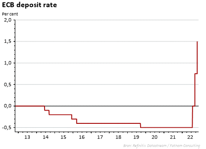 Ce message a fait baisser les prévisions en matière de taux sur les marchés financiers. On table actuellement sur une nouvelle majoration des taux de 50 points de base en décembre. En février et mars, le taux devrait augmenter à chaque fois de 25 points de base pour atteindre un maximum d’environ 2,5% en 2023.
