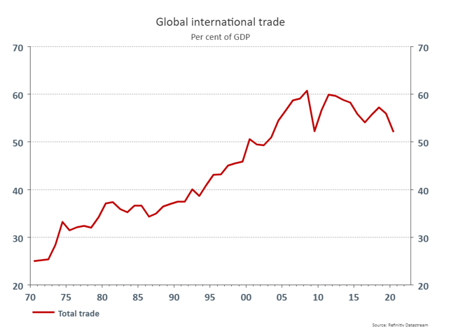 Mais en fait, qu'entend-on par mondialisation ? En résumé, il s'agit d'un processus d'intégration politique et économique entre pays. Avec à la clé une augmentation des flux transfrontaliers de biens, de services, de capitaux, de personnes et d'idées. On craint que la succession de chocs de ces dernières années n’entraîne un ralentissement ou une inversion de ce processus. Bref, une démondialisation.