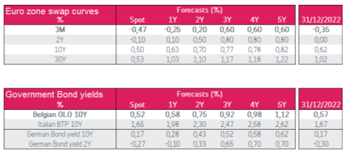 Jeudi , le taux des obligations d'État européennes à dix ans a augmenté suite à la décision en matière de taux. Pour l'Allemagne et la Belgique, la hausse est restée limitée à respectivement 11 et 14 points de base. Le taux italien a été relevé de 22 points de base. Nous nous attendons à ce que les écarts de taux entre les États membres européens se creusent encore cette année, en raison de l’abandon des achats nets dans le cadre du programme d'achats d'urgence face à la pandémie (PEPP), qui a principalement porté sur des achats de titres d'États membres fortement endettés. À moyen terme, nous prévoyons une hausse progressive du taux à dix ans sur les dettes belges. Le taux à long terme augmente moins vite que le taux à court terme, étant donné que la banque centrale ne réduira pas son bilan pour le moment. Les réinvestissements de titres qui arrivent à échéance pèseront encore un certain temps sur le taux à 10 ans.