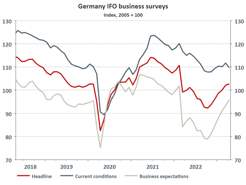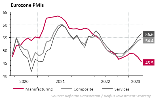 En ce qui concerne le secteur manufacturier, les indicateurs de confiance nous dépeignent un tableau relativement optimiste également, même si moins spectaculaire que celui des services. Après une année 2022 particulièrement périlleuse, la confiance des chefs d’entreprise se rétablit en Allemagne. L’indicateur IFO se redresse pour un sixième mois consécutif, grâce à l’apaisement de la crise énergétique et des pénuries. Une excellente nouvelle pour la zone euro: l’Allemagne représente la première puissance industrielle de l’Europe et joue un rôle de locomotive pour tout le secteur manufacturier européen, et celui la Belgique en particulier.