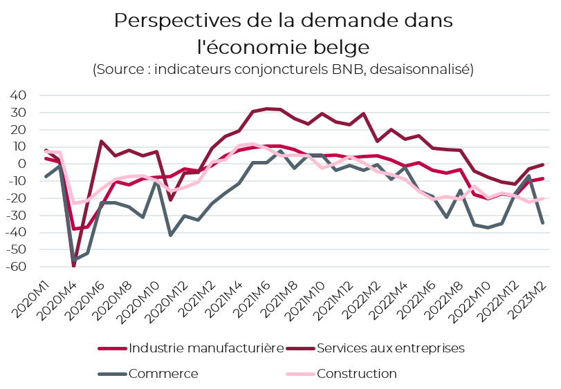 Les différences entre les secteurs sont importantes. Dans l’industrie, l'activité a perdu 1% au dernier trimestre de 2022, alors que la croissance dans les secteurs des services et de la construction se poursuivait à raison de, respectivement, 0,3% et 0,8%. En février, nous constatons un regain d'optimisme chez les fabricants belges ainsi que chez les entrepreneurs dans la construction. Mais, dans le secteur des services, nous constatons une détérioration, surtout dans le commerce.