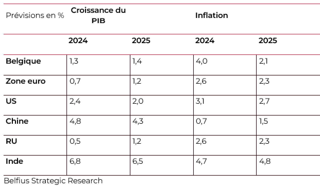 Il ne s’agit que d'une première baisse des taux mais elle peut quand même contribuer au regain de confiance des entrepreneurs. Grâce à un taux plus bas, les investissements deviennent meilleur marché pour les entreprises. L'activité dans le secteur des services a déjà le vent en poupe depuis un certain temps et a encore accéléré en mai. Les chefs d’entreprises dans l’industrie sont également devenus plus optimistes ces derniers mois. Belfius Strategic Research attend à ce que le redressement économique du début de cette année se maintienne cet été et nous augmentons notre prévision pour la croissance du PIB à 0,7 pour cent dans la zone euro en 2024.