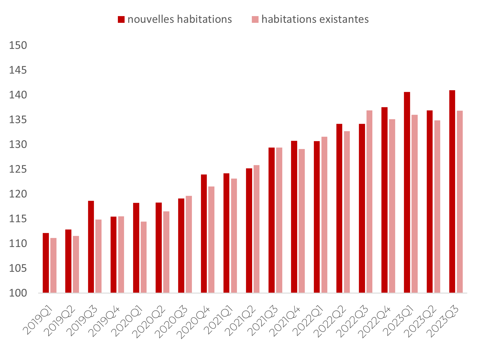 La scission du marché immobilier selon la ligne de rupture durable - non durable se voit clairement dans les indices des prix immobiliers pour les maisons neuves versus existantes. En été de l’an dernier, le prix de ces dernières a stagné, tandis que celui des habitations neuves augmentait de plus de 5 pour cent.