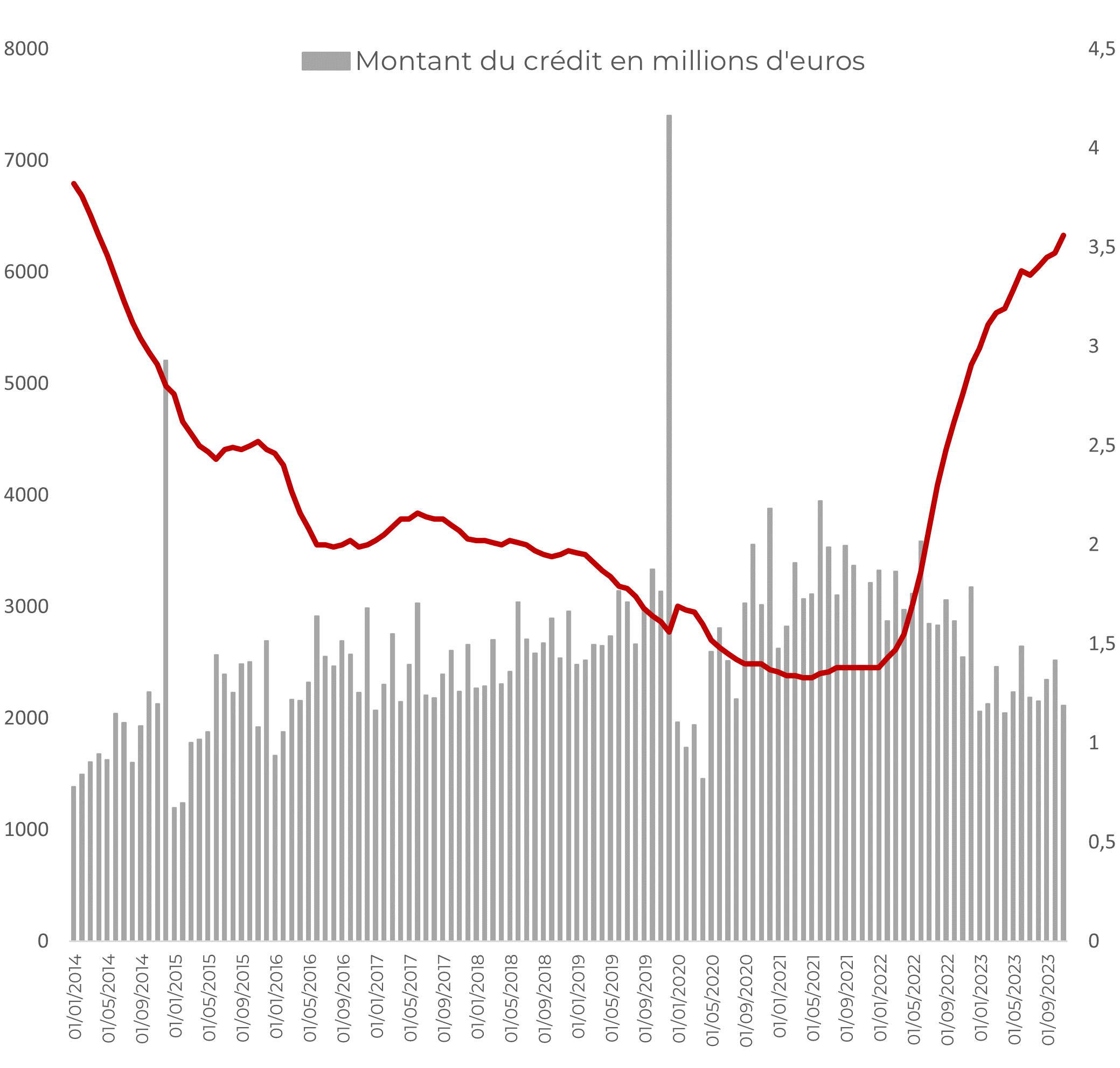 Jusque début 2022, le taux était l'une des forces motrices de la forte demande sur le marché immobilier, ce qui a entraîné une forte augmentation de l’activité et des prix. En raison de la faiblesse des taux, les acquéreurs et les constructeurs pouvaient emprunter de l’argent bon marché. De même, les investisseurs s'intéressaient fortement au marché immobilier en tant qu’alternative aux revenus d’intérêts relativement bas des investissements classiques. Depuis lors, les taux à long terme sur les marchés financiers et les taux hypothécaires se sont accrus rapidement. Compte tenu en outre de l’incertitude économique, l’appétit pour l’achat d'habitations s’est tari.