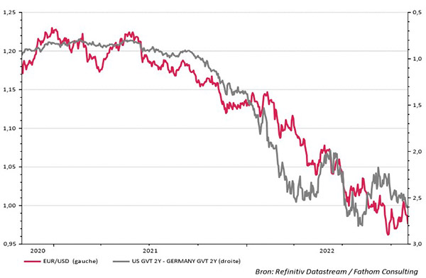 En ce qui concerne la zone euro, la Banque centrale européenne (BCE) procède également à des hausse de ses taux directeurs. Cependant, la Fed s’est montrée plus agressive ce qui se traduit par une divergence grandissante entre les taux américains et allemands (la référence pour la zone euro). Les taux des obligations d’États à 2 ans, qui tiennent compte de la réactivité des banques centrales, ont ainsi augmenté aux États-Unis de 0,73% en début d’année à plus de 4% aujourd’hui. En Allemagne, cette augmentation de taux a été plus timide passant de -0,6% à un près de 2% sur la même période.