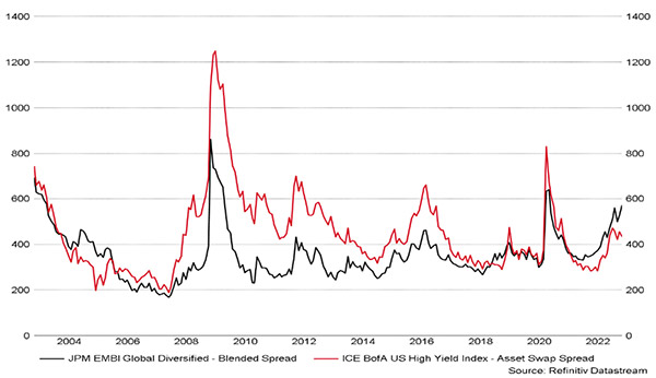 Graphique 3: Prime de risque US HY (en rouge) versus dette émergente en USD (en noir)