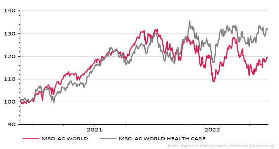 Les soins de santé ont en effet cette caractéristique d’être défensifs c’est-à-dire qu’ils fluctuent plus faiblement que la tendance de marché. Quand le marché global baisse, les actions soins de santé baissent plus faiblement. En effet, nous « consommons » des soins de santé quel que soit le climat boursier. Les soins de santé sont également généralement décorrélés des tendances du marché. Il arrive fréquemment que le marché baisse mais que les soins de santé augmentent.