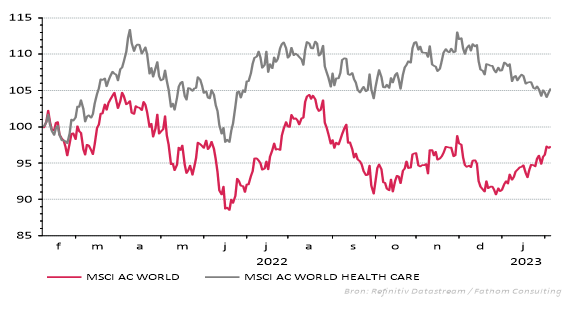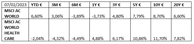 Le graphique ci-joint3 montre les évolutions des indices mondiaux MSCI AC World et MSCI AC World Healthcare. L’année 2022, très difficile pour les marchés mondiaux a par contre montré une certaine résilience des marchés liés aux soins de santé. Par contre, depuis le début de l’année, c’est plutôt l’effet inverse qui se produit.