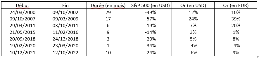 Tableau : évolution du S&P 500 en périodes de fortes baisses et évolution du prix de l’or