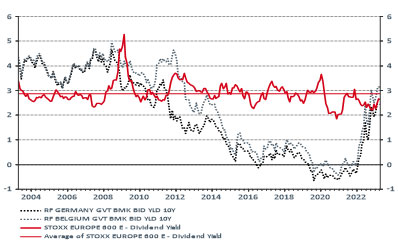 Cette hausse des taux peut augmenter l’attractivité des obligations mais qu’en est-il du rendement des dividendes (rapport dividendes/cours), ou « dividend yield » en anglais ? Est-il suffisamment rémunérateur ? A ce sujet, le graphique 2, comparant les rendements des obligations d’états belge et allemand à 10 ans au dividend yield de l’indice Stoxx 600 (référence des actions européennes) apporte quelques éclaircissements.