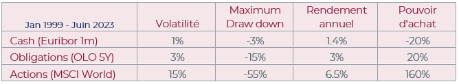 Nous avons analysé cette relation en comparant la volatilité et le maximum drawdown des actions, des obligations et d’un placement à court terme en EUR. Pour ce faire, nous avons pris respectivement l’indice MSCI World (indice mondial d’actions), les obligations d’Etat belges (OLO) à 5 ans et l’Euribor 1 mois sur une période allant de 1999 à mai 2023.