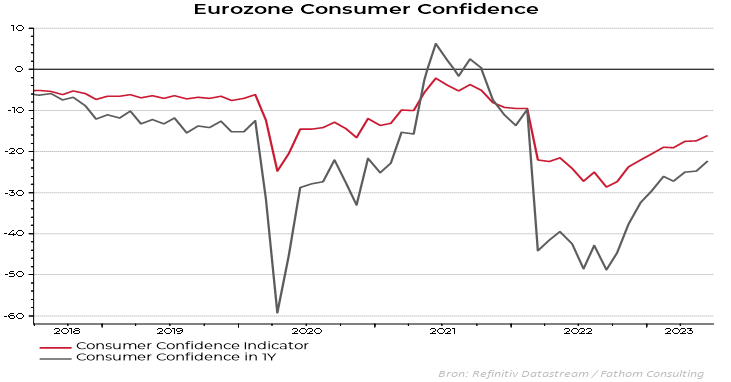 Il faut dire que la faiblesse persistante de la confiance des ménages, comme le montre le graphique ci-dessous (niveau de confiance actuel et attendu dans 1 an), laisse présager une baisse de la consommation dans les mois à venir. La stagnation des ventes au détail dans la zone euro confirme les très mauvais résultats depuis la réouverture de l'économie après la pandémie. Les perspectives de la consommation des ménages sont donc médiocres. Cela dit, les attentes des commerçants en matière de prix de vente ont été revues à la baisse récemment, ce qui pourrait entraîner une baisse de l'inflation et devrait soutenir la consommation.2