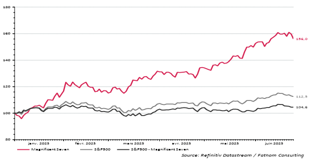 Contrairement aux indices européens, les principaux indices aux États-Unis sont fortement exposés à certains secteurs (p.e. les valeurs technologiques qui pèsent pour 30% de l’indice MSCI USA) et également à certaines valeurs vedette. Les « Magnificent Seven » que sont Amazon, Microsoft, Nvidia, Apple, Tesla, Alphabet (Google) et Meta (Facebook) ont progressé de plus de 55% depuis le début de l’année et ont donc fait progresser le MSCI USA de 12%. Mais c’est l’arbre qui cache la forêt : Sans ces 7 merveilles, ce même indice enregistre une performance limitée à 4%.4