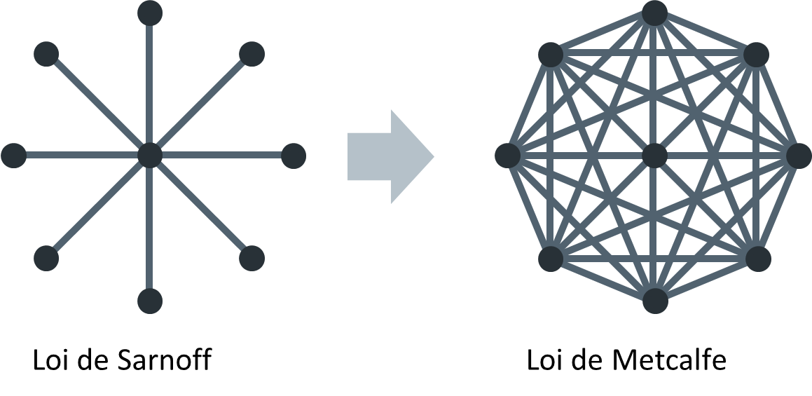 L’avènement de la télécommunication a donné une autre dimension aux effets de réseau. Pionnier de l’internet, Robert Metcalfe a découvert que la valeur d’un réseau téléphonique ou d'un réseau d'ordinateurs connectés entre eux (ethernet) augmentait, non de façon linéaire, mais bien exponentielle avec le nombre d’utilisateurs. En effet, la communication ne se fait pas entre un orateur et différents auditeurs, mais bien entre tous les utilisateurs. C’est pourquoi le nombre de connexions (et donc de communications potentielles) augmente de façon exponentielle avec le nombre d'utilisateurs (voir schéma ci-dessous).
