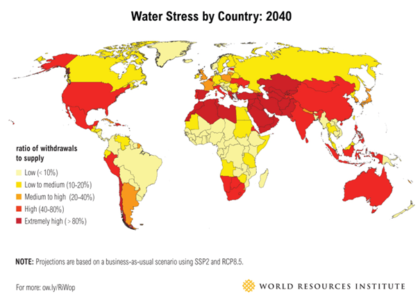 La plupart des pays densément peuplés connaîtront des épisodes de stress hydrique au cours des 20 prochaines années, comme l’illustre la carte publiée par le World Resource Institute ci-dessous5.