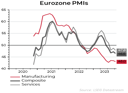 Les enquêtes PMI flash d'octobre montrent que l'activité économique a mal démarré au quatrième trimestre, en particulier en Europe. La faiblesse de l'activité réduit la pression sur le marché du travail et l'inflation. La Fed et la BCE ont peut-être fini de relever leurs taux d'intérêt officiels à court terme.