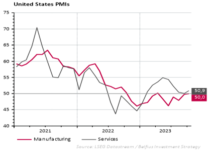 Il existe néanmoins des différences entre les économies. Les États-Unis ont été un point positif, où le PMI composite d'octobre a montré une légère augmentation de l'activité. En revanche, dans la zone euro, les indices PMI indiquent toujours une contraction du PIB.