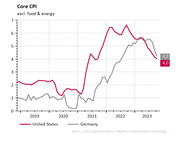 Les banques centrales semblent adopter actuellement une attitude plus attentiste pour différentes raisons. Tout d’abord, les chiffres de l’inflation sont encourageants. L’inflation dans la zone euro et aux États-Unis s’inscrit en nette diminution. La politique stricte des banques centrales semble donc avoir bel et bien un effet sur l’inflation. Le graphique ci-dessous montre l’inflation structurelle. Elle est estimée en ne tenant pas compte des prix très fluctuants de l’énergie et de l’alimentation. Les banques centrales veulent d’abord attendre de connaître l’ampleur de l’effet avant d’encore majorer le taux. Elles veulent ainsi éviter que de nouvelles hausses de taux ne portent trop fortement préjudice à l’économie.