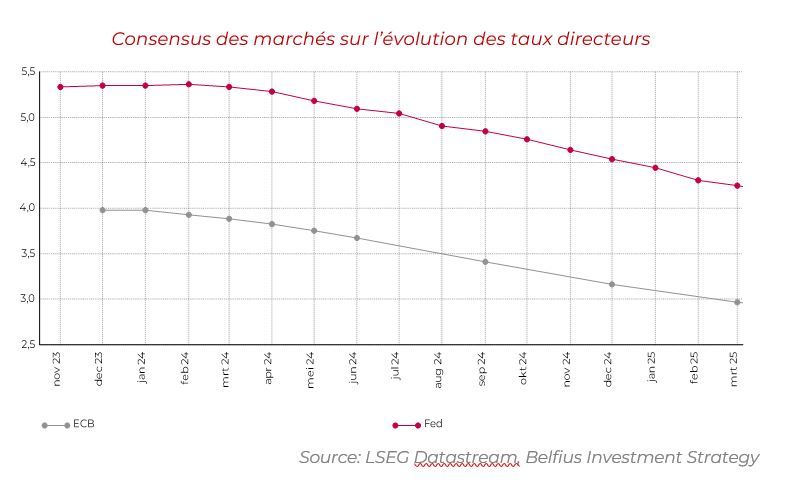 Sur la base de ces attentes, par anticipation de la baisse des taux directeurs, les taux longs (qui reflètent plus le sentiment des marchés) se sont tassés en novembre, même si les banques centrales tentent de tempérer les enthousiasmes dans leurs discours.