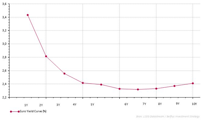 En Europe, la courbe des taux est inversée. Autrement dit, les obligations à court terme offrent un rendement supérieur aux obligations à moyen ou long terme. Il s’agit d’un phénomène rare. En général, plus les investisseurs investissent à long terme, plus ils exigent un taux élevé. Une obligation à 10 ans implique en effet un risque plus élevé qu’une obligation à 1 an.