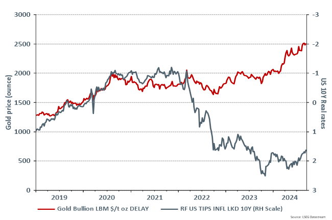 La forte accélération de l’inflation a forcé la Banque centrale américaine à durcir rapidement sa politique monétaire. Ce cycle de resserrement monétaire qui a débuté en février 2022 a provoqué une hausse des taux d’intérêt réels sans pour autant que le prix de l’or baisse.